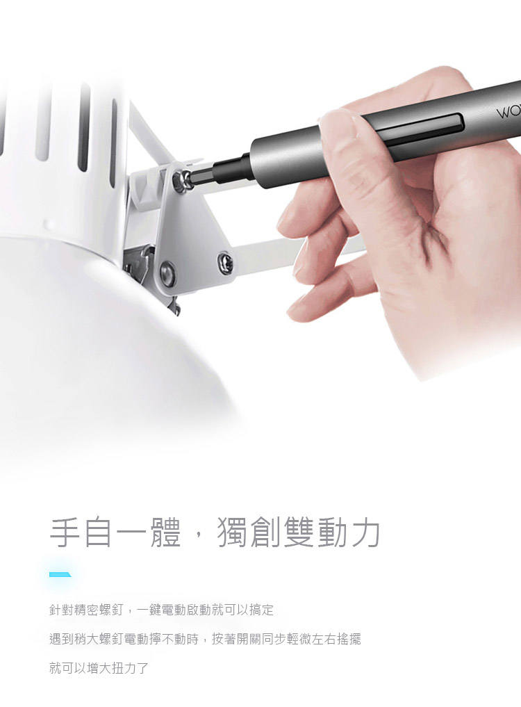 電動螺絲批,每分鐘200次轉動,觸控電動轉動和手動扭動可以同時使用,可以話是市面上最得心應手的電動螺絲批,批頭仲有LED照明系統,用過返唔到轉頭!最新版本改用了內置鋰電池充電式設定,方便用戶以MicroUSB充電,不用再找3A電池了...當然超豪華配件也是超級亮點!最重要咁正既產品都唔洗$400!