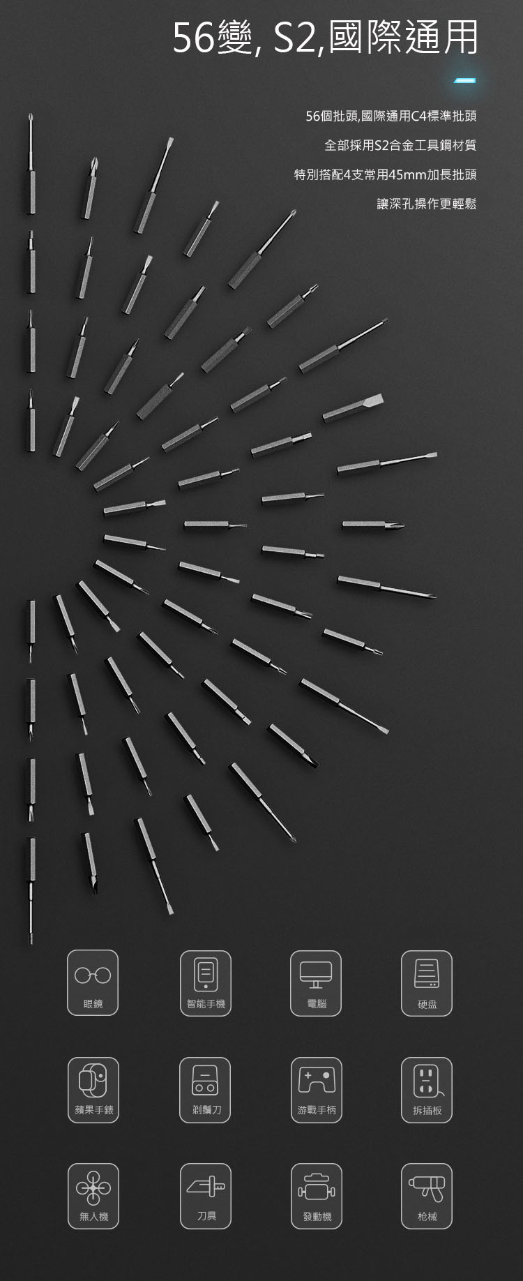• 標配56個批頭,適合不同用途