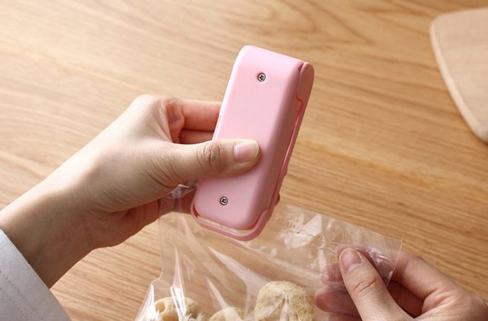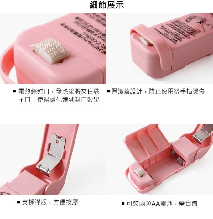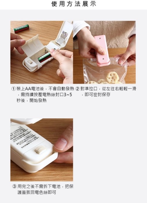 裝入兩節5號電池,待升溫後,對准開口,從左往右輕輕一壓即可。*本品適用於鋁箔袋,聚丙烯,聚乙烯,氯乙烯材質為0.1mm厚的袋子。